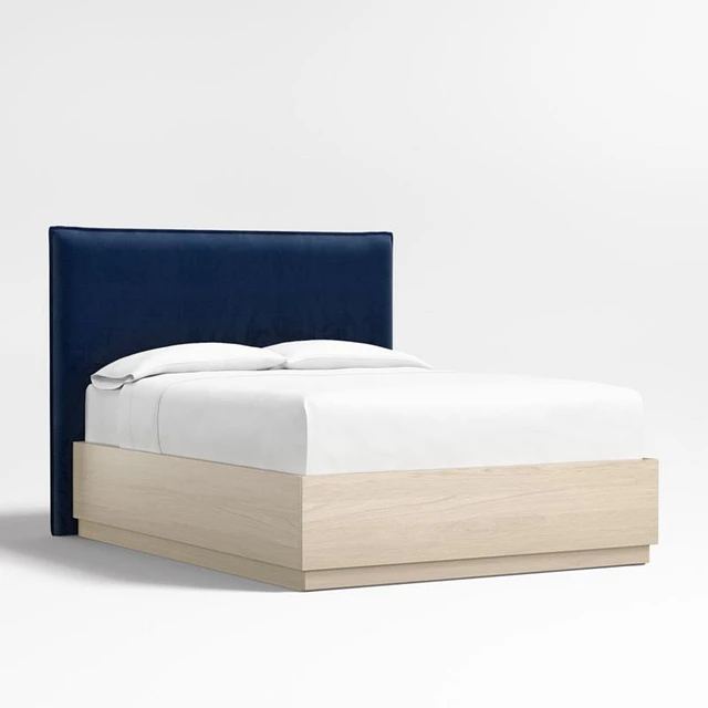 Arden 60" Navy Queen Upholstered Headboard with Batten Brown Oak Bed Base