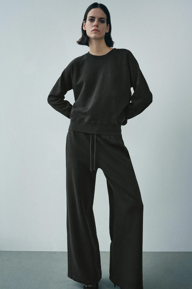 Pants made of a cotton blend. Mid waist and adjustable elastic drawstring waistband. Side pockets. Wide leg