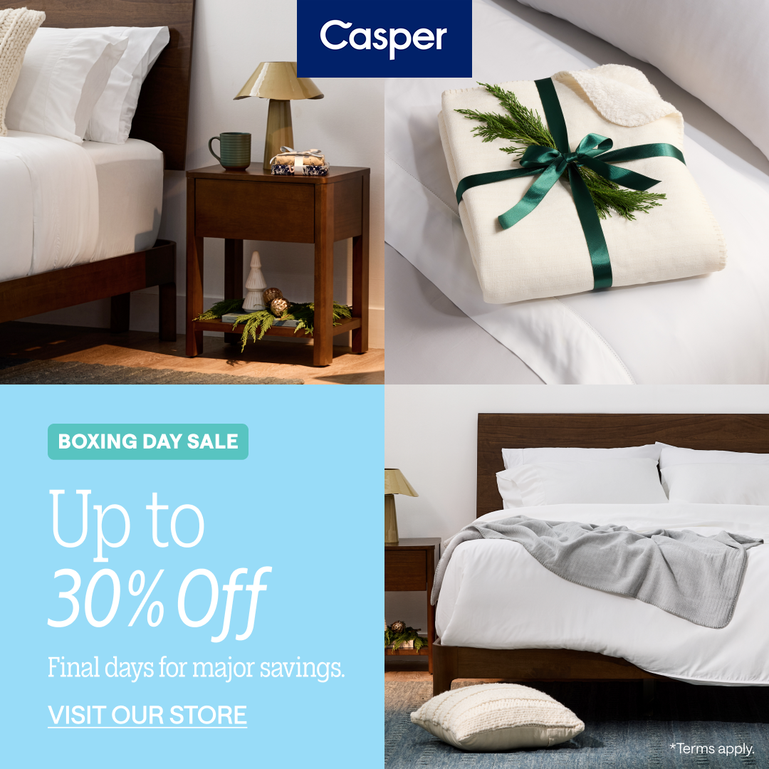 Fri, 19 Dec 2025 - Tue, 6 Jan 2026Casper Canada's Boxing Day Sale is on now! 💥 Enjoy up to 30% off storewide. Save on mattresses, pillows, sheets & more.