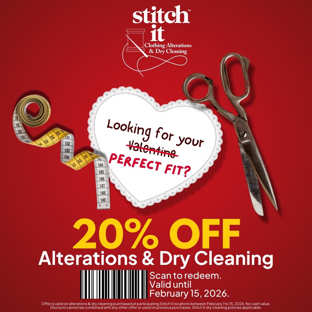 Looking for your perfect? Stitch It has you covered! Save 20% off alterations & dry cleaning from February 1st to 15th. Feeling confident in your clothing has never been easier, don't miss out! Conditions apply. See stitchit.com/deals for details.