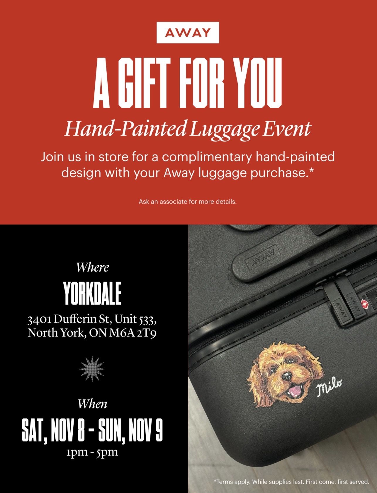 2025-11-08 - 2025-11-09Join us in store for a complimentary hand-painted design with your Away luggage purchase.